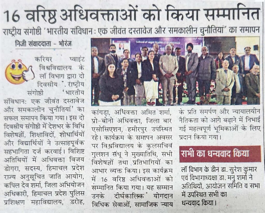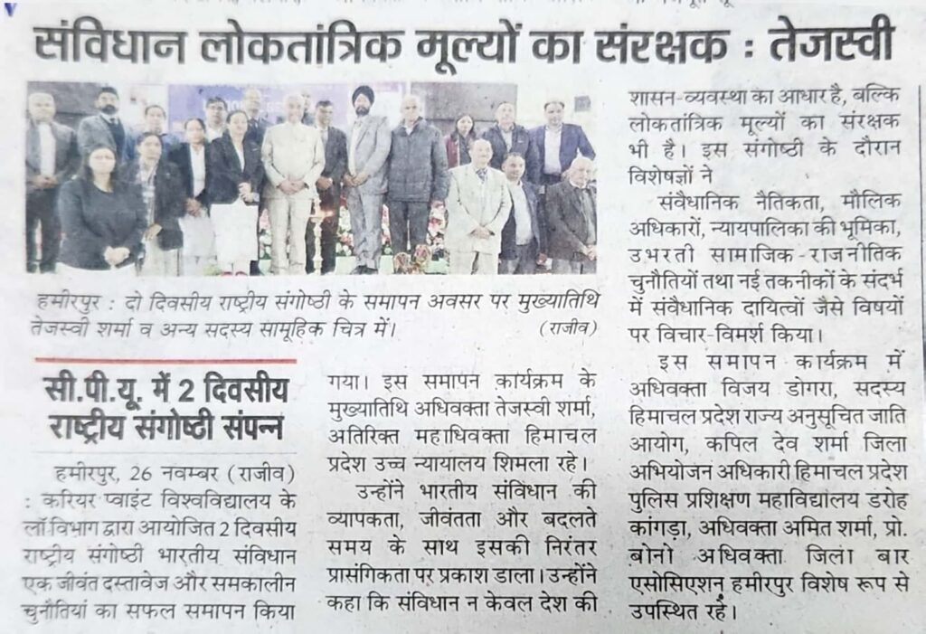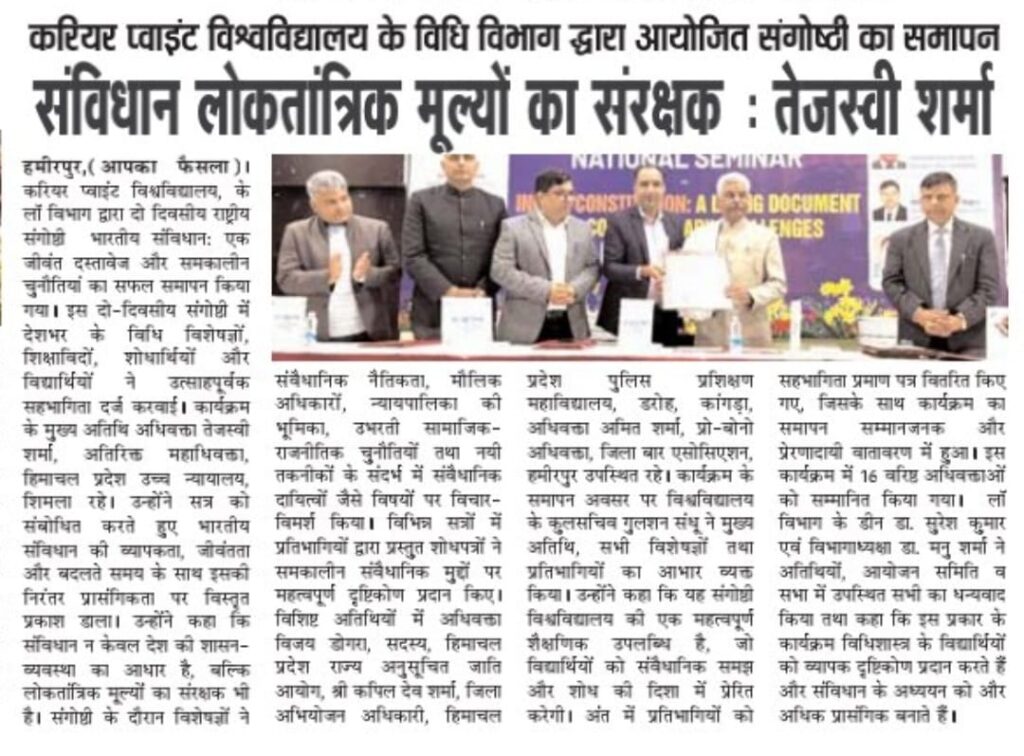 केरियर पोआंईट युनिवर्सिटी में संविधान दिवस पर नेशनल सेमिनार आयोजित, मुख्यातिथि तेजस्वी शर्मा तथा विजय डोगरा ने संविधान को देश के लिए बताया महत्वपूर्ण